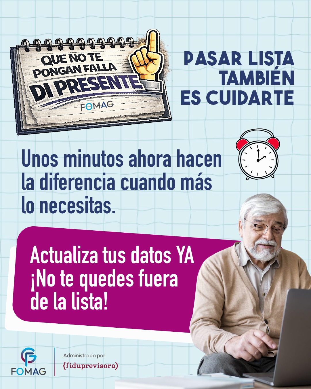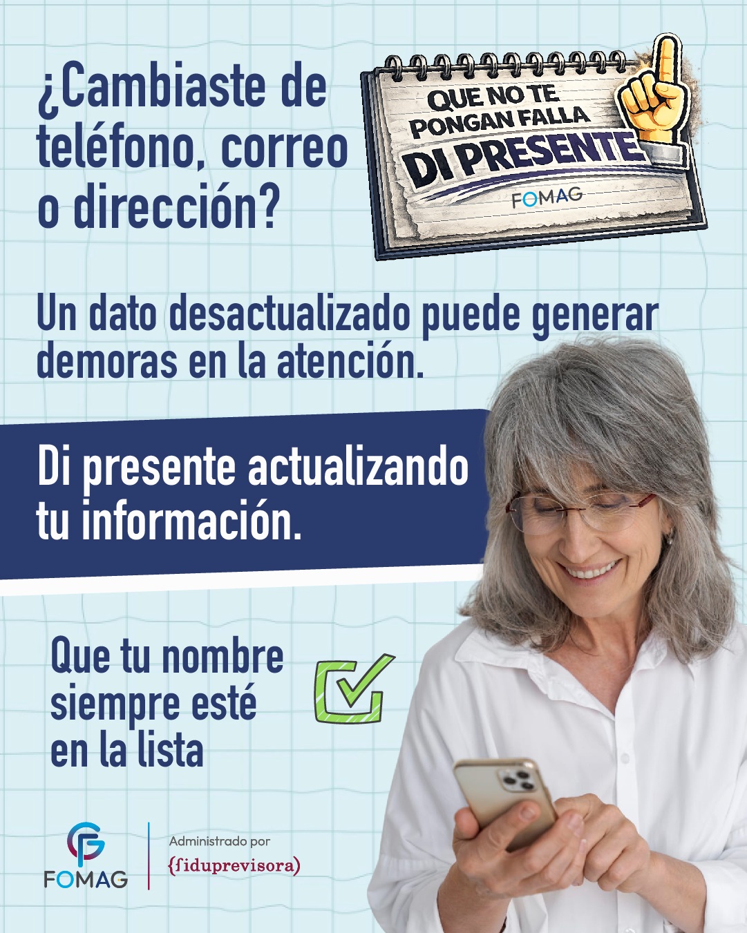En atención al comunicado allegado por el Fondo Nacional de Prestaciones Sociales del Magisterio, la Secretaría de Educación se permite informar que el FOMAG ha dado inicio a la campaña de actualización de datos, dirigida a docentes, pensionados y beneficiarios afiliados, con el propósito de contar con información actualizada y confiable que facilite el contacto oportuno para notificaciones, trámites y demás situaciones de interés para los afiliados.