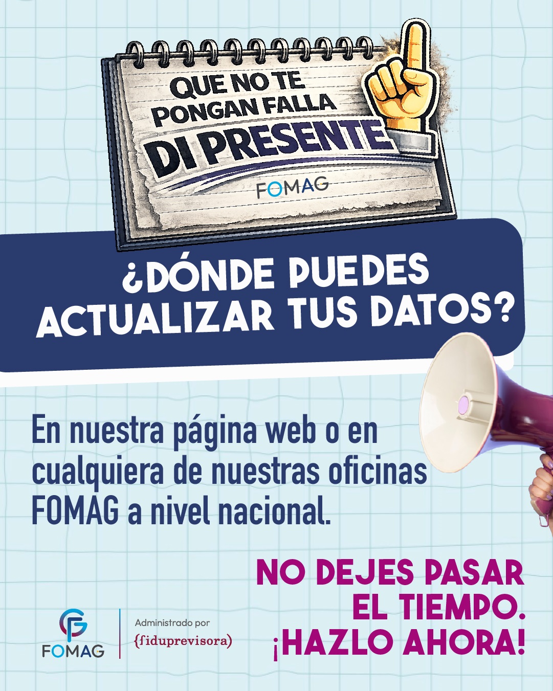 En atención al comunicado allegado por el Fondo Nacional de Prestaciones Sociales del Magisterio, la Secretaría de Educación se permite informar que el FOMAG ha dado inicio a la campaña de actualización de datos, dirigida a docentes, pensionados y beneficiarios afiliados, con el propósito de contar con información actualizada y confiable que facilite el contacto oportuno para notificaciones, trámites y demás situaciones de interés para los afiliados.